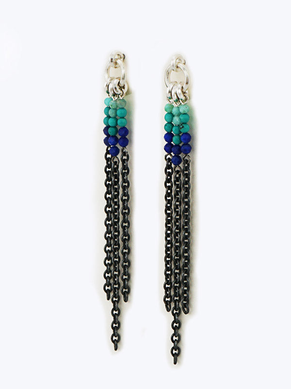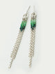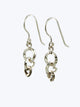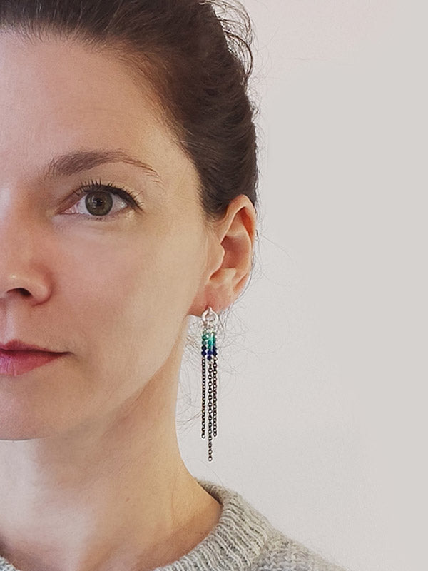 Sie sind komplett aus 925er Silber gefertigt. Die Aufhängung ist ein kleiner Kreis, den wir selbst gefertigt haben. Das Einzigartige ist der Sechskantdraht, den wir extra dafür ziehen und dann zu Ösen wickeln und verlöten. Der größere Kreis ist in einen kleineren Sechskantkreis eingehängt, an den der Ohrsteckerstift gelötet ist. Die feinen Kettchen haben wir geschwärzt.