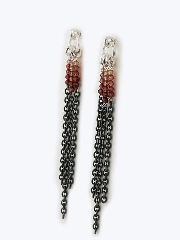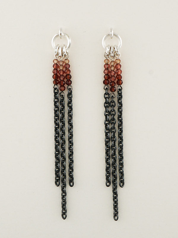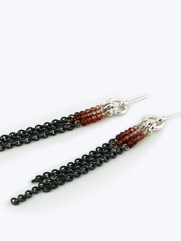 Das Besondere dieser Ohrhänger ist der wunderschöne Farbverlauf: Zwischen dem oberen silbernen und dem geschwärzten unteren Teil fügen sich die Edelsteine (roter Granat und Mandaringranat) im Verlauf ein.